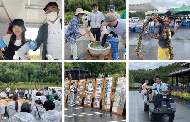 今回はお米の収穫祭ではありますが、チームごとのパネル発表に加え、新米おにぎり、豚汁、BBQ、山椒アイス、ドリンクバー、よもぎ茶の振る舞いなどもあり、柳屋チームの柿の葉寿司・稲荷寿司手作り体験も好評でした。また、トラクター体験やラジコン草刈り機体験、運搬機乗車体験など普段使うことのない農業機械に触れる貴重な機会になりました。農業機械がアトラクションで使えるというのは大発見で、こういう遊び心を取り入れることも農業を楽しむ一つの方法になると知りました!