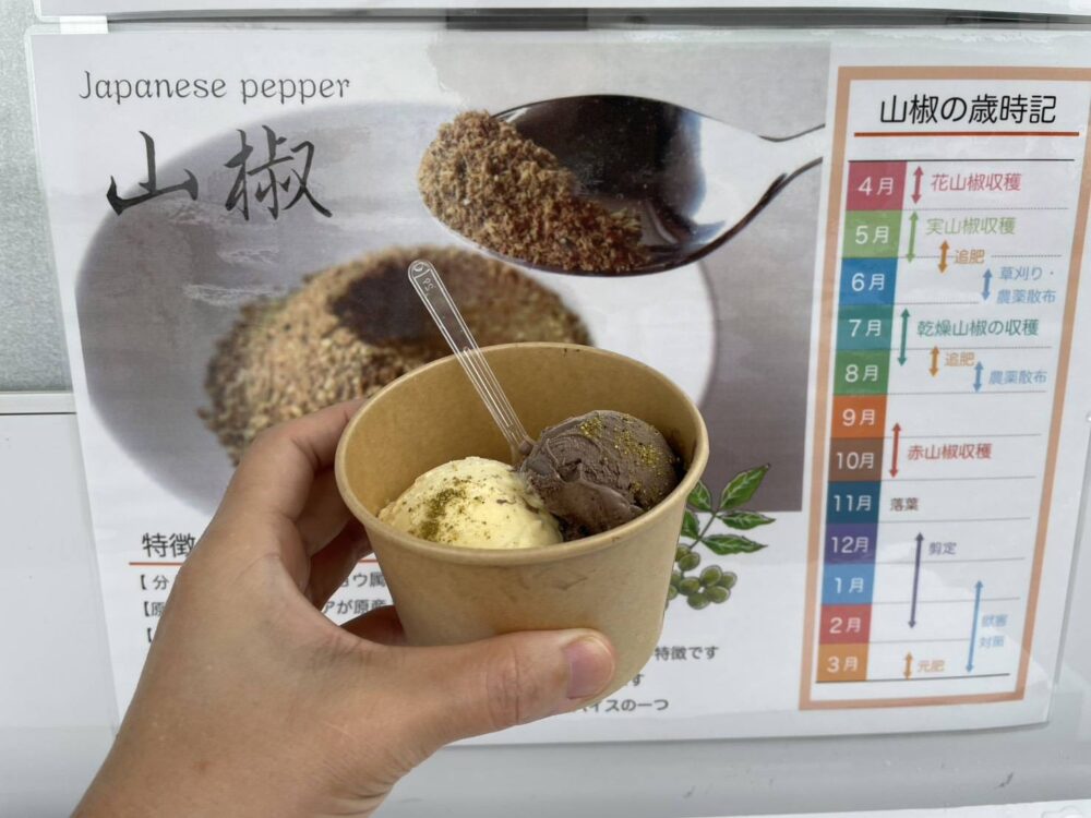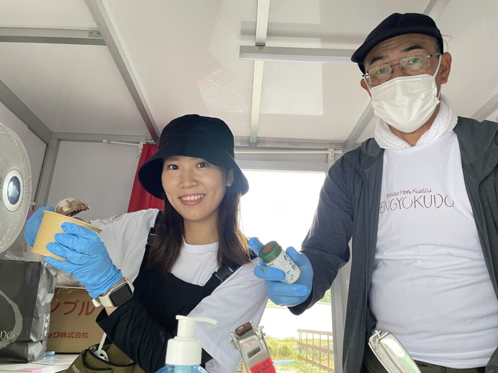 山椒チームは、バニラとチョコのアイスに柳屋のぶどう山椒をトッピングして提供しました。まろやかな甘さのアイスに山椒の風味とピリッとした刺激が程よく合わさり、「おいしい!」と好評でした。想定より多く出たため途中でアイスが足りず、買いに走るというハプニングもありましたが、多くの方に喜んでいただき、山椒チームの結束力が一層高まった一日となりました。