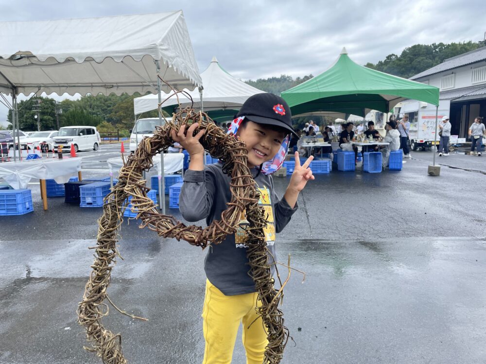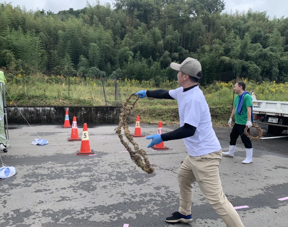 葛のつるで作ったリースを投げ、三角コーンに入った点数を競う輪投げを企画しました。小さなリースと巨大なリースがあって、それぞれ3回づつ投げるのですが、投げるのにコツが必要なこともあり、予想以上に楽しんでいただきました。全体でみると野球経験者が上位を占める結果となりました。