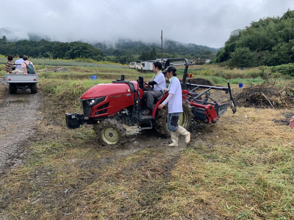 その後、奇跡的に快晴となり、昼からは農機具を使ったアトラクションや、メインイベントとなる「米の収穫体験」も行うことができました。