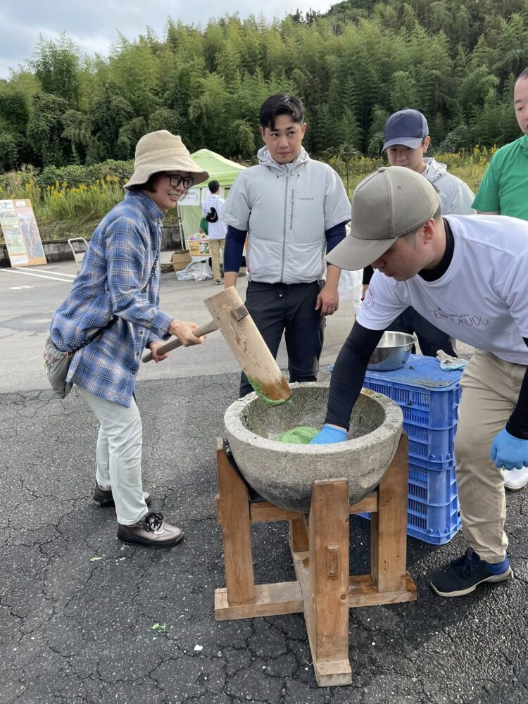 チーム全員揃って、天極堂ファームで収穫したよもぎを使用しての『よもぎ餅つき』。焼き餅やあんこ餅など多彩な食べ方で楽しんでいただき、「美味しい」「初めての餅つき楽しかった」と大好評でした。