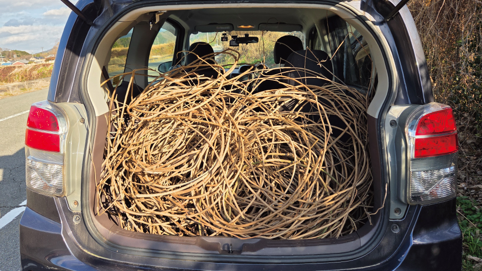 かごを作るにはそれなりの量・長さが必要なので、車のトランクが埋まる程つるを取ることも…!