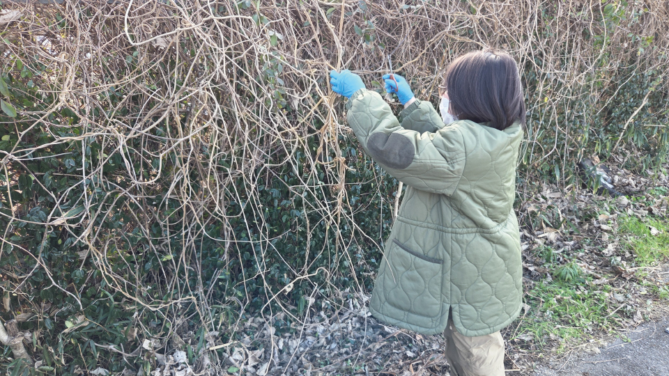 というのも、葛のつるはフェンスによく絡まっているため、取る際には綱引きのように引っ張ってからカットします。