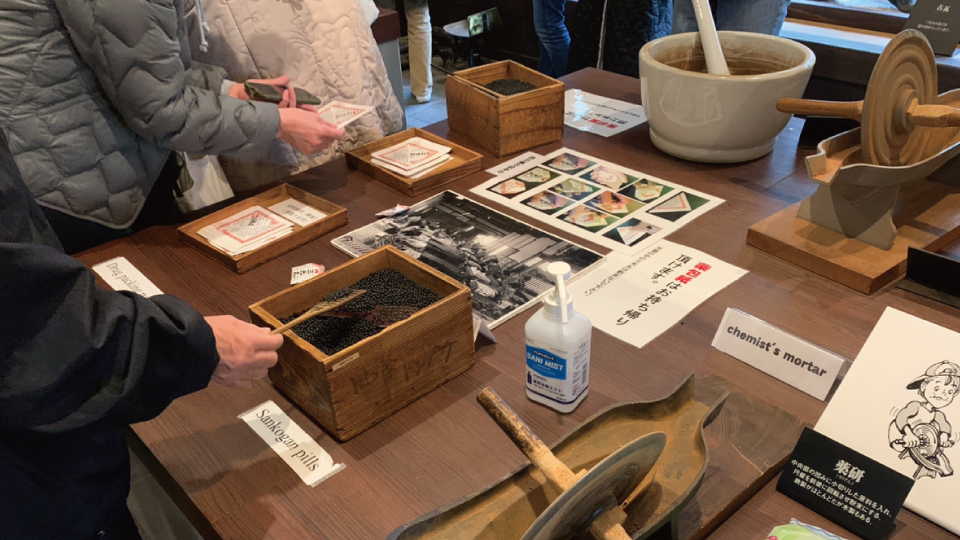 また昔使われていた薬を作るための道具を実際に触ることが出来るコーナーや、三光丸のパッケージの歴史などが展示されています。
