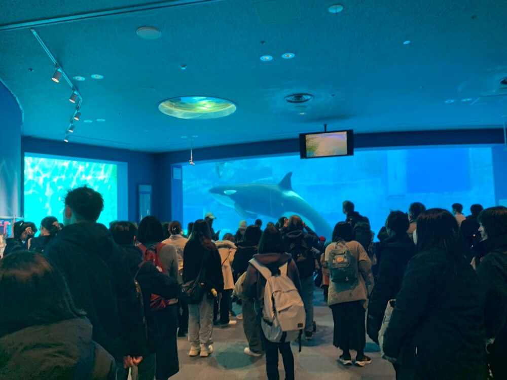 名古屋港水族館はイルカ、シャチ、ベルーガのプールがあり、みんな元気に泳いでいるところから始まりました。骨格標本や実物大模型があって大きさに圧倒されます。