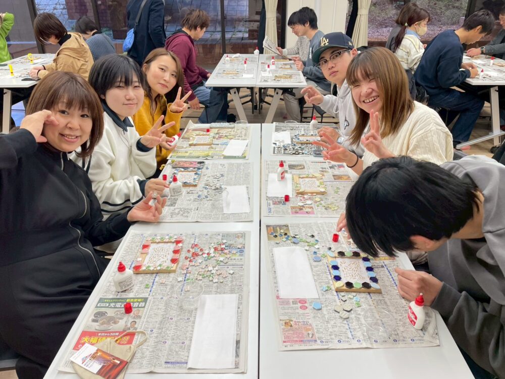 モザイクタイルミュージアムでは見学の後に写真立て作り体験。ぱぱっと終わる人、時間いっぱいまで作りこむ人、ちょっとしかタイルを貼らない人、ぎっしり貼りつける人など個性あふれる写真立てができました。