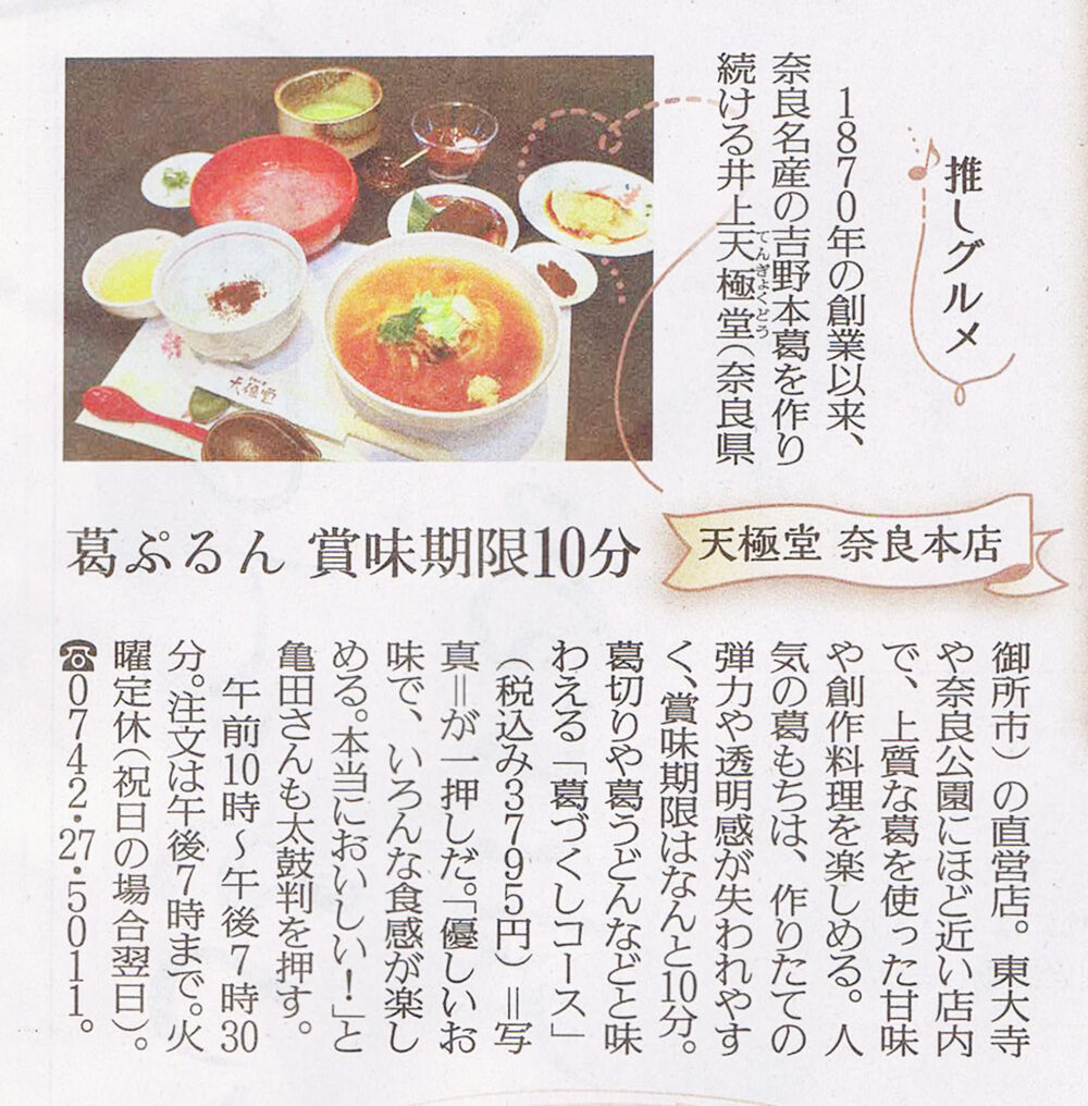 2025年10月8日の読売新聞の正倉院展の特集で、天極堂奈良本店の「葛づくしコース」を推しグルメとしてご紹介いただきました。