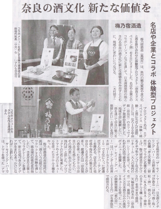 梅乃宿酒造が新たに開始する、奈良県内の観光資産や食文化と酒を掛け合わせた体験型プロジェクト。