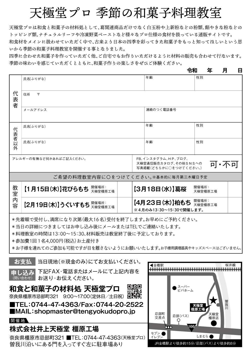 2026年1月から月に1回天極堂にて、天極堂プロの食材を使った「季節の和菓子料理教室」を行ないます。